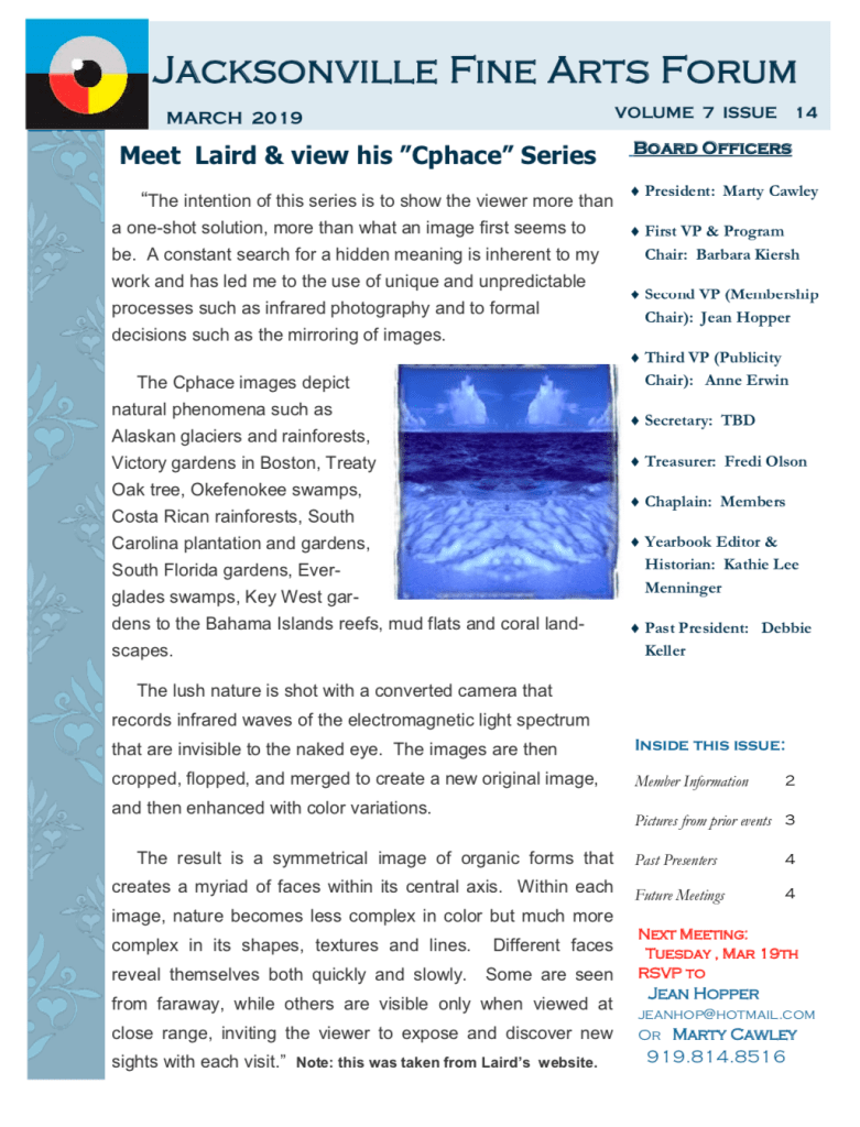 October 13, 2019November 25, 2019 jaxfineartsforum March 2019 Newsletter n-march-2019Download Share this: Share on X (Opens in new window) X Share on Facebook (Opens in new window) Facebook Like Loading... Related