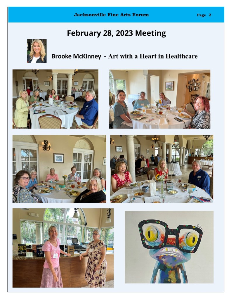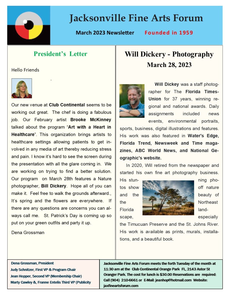 March 13, 2023 jaxfineartsforum March 2023 NEWSLETTER Share this: Share on X (Opens in new window) X Share on Facebook (Opens in new window) Facebook Like Loading... Related