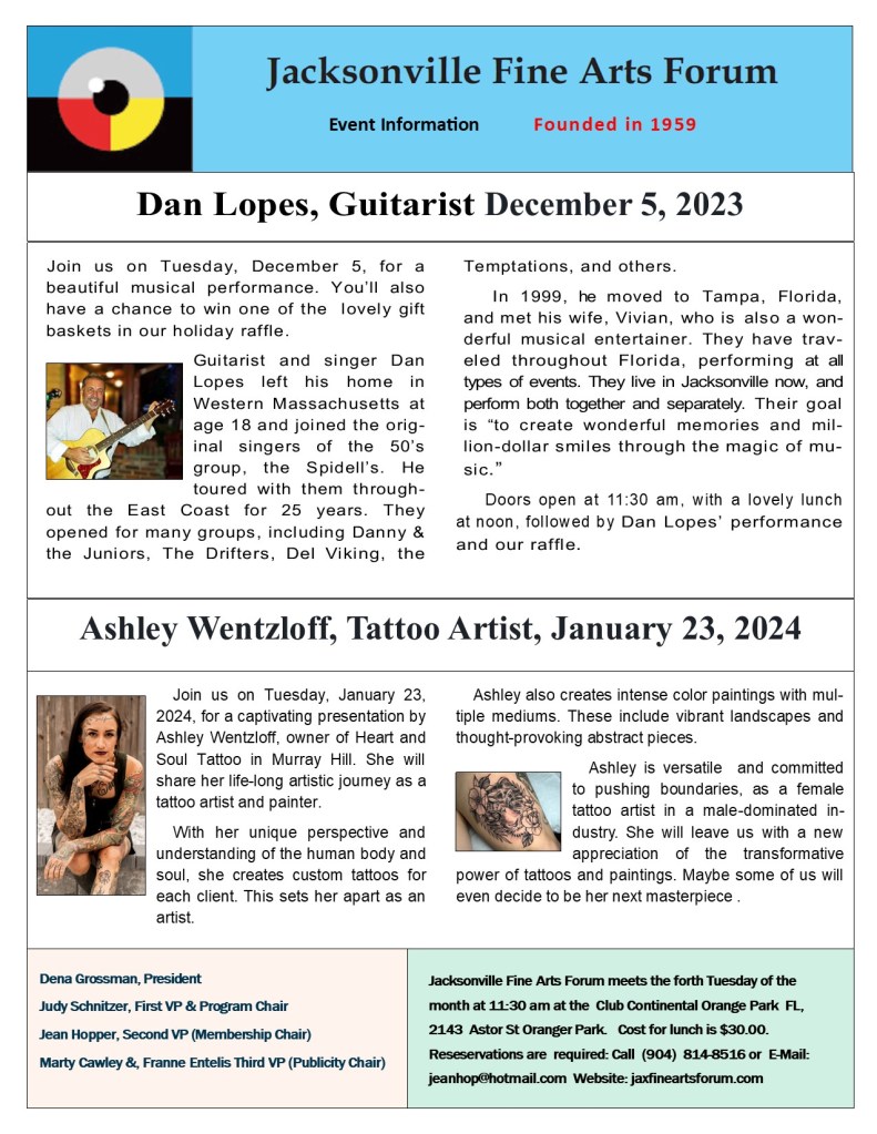 November 20, 2023November 20, 2023 jaxfineartsforum December 2023 Newsletter Share this: Share on X (Opens in new window) X Share on Facebook (Opens in new window) Facebook Like Loading... Related